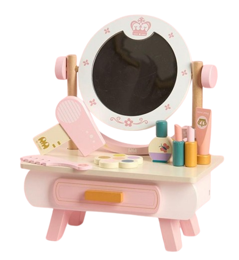 고급스러운 원목으로 만들어진 파스텔톤의 예쁜 화장대입니다. 회전하는 거울을 보면서 화장을 하거나 머리를 말리는 등 재미있고 다양한 역할놀이를 해보세요!