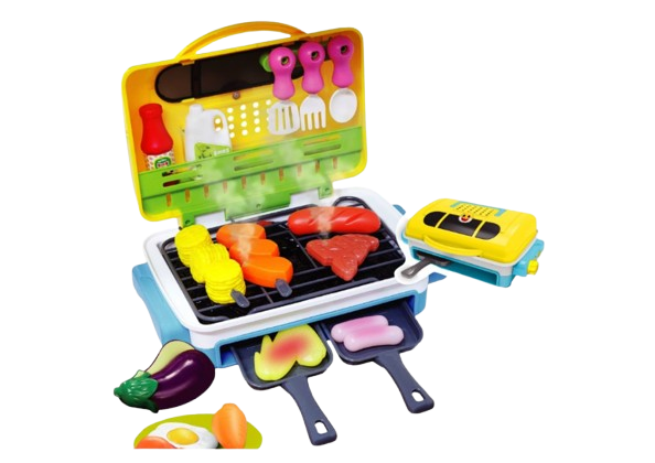 노래하는 바비큐 놀이세트. 슉슉 수증기와 불빛이 나오면서 지글지글 맛있게 구워지는! 오븐에 넣고 구우면 색이 변하는 2가지 음식, 조리도구들로 싹둑싹둑 분리되는 재료들로 더욱 실감나는 바비큐 놀이해요!