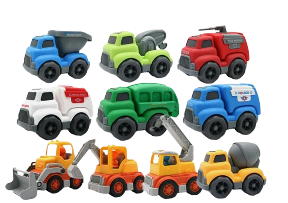 트럭, 견인차, 레미콘, 경찰차, 구급차, 소방차, 청소차 다양한 차종으로 직업탐구와 역할놀이 가능.