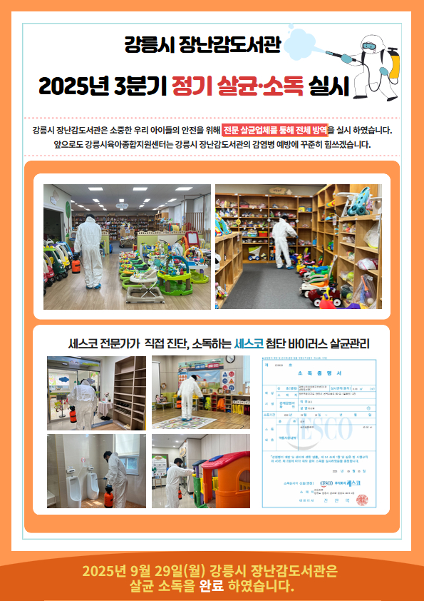 강릉시 장난감도서관 2025년 3분기 정기 살균 소독 실시 페이지 정보 작성자 관리자1 댓글 0건 조회 78회 작성일 25-09-30 13:29 목록 본문 다음글공휴일 휴관 안내 25.09.19