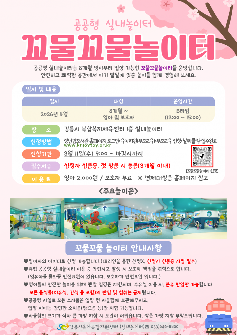 공공형 실내놀이터 영아전용시간 운영 안내 페이지 정보 작성자 관리자1 댓글 0건 조회 1,342회 작성일 25-10-24 17:24 목록 본문 많은 관심과 참여 부탁드립니다! 이전글2025년 4분기 신규장난감 입고안내 25.11.19 다음글'플리마켓 & 놀이마당' 행사로 인한 운영 변경 안내 25.10.20
