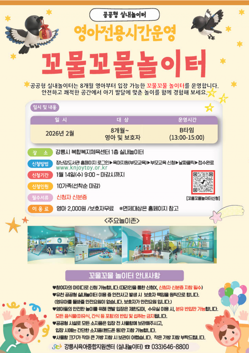 공공형 실내놀이터 영아전용시간 운영 안내 페이지 정보 작성자 관리자1 댓글 0건 조회 928회 작성일 25-10-24 17:24 목록 본문 많은 관심과 참여 부탁드립니다! 이전글2025년 4분기 신규장난감 입고안내 25.11.19 다음글'플리마켓 & 놀이마당' 행사로 인한 운영 변경 안내 25.10.20