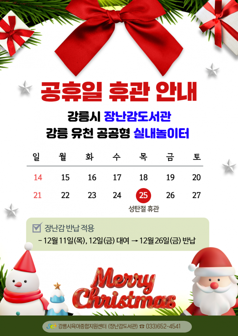공휴일 휴관 안내 페이지 정보 작성자 관리자1 댓글 0건 조회 15회 작성일 25-12-11 16:07 목록 본문 . 다음글2025년 육아종합지원센터 이용자 만족도 조사 25.11.25