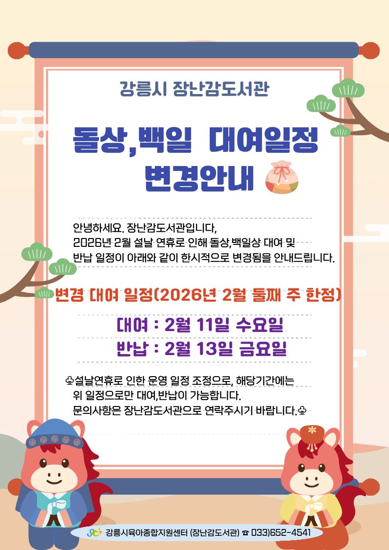 2026년 2월 돌상 백일상 설 연휴로 인한 일정 변경 안내 페이지 정보 작성자 관리자1 댓글 0건 조회 3회 작성일 25-12-31 17:48 목록 본문 항상 돌상,백일상 대여 서비스를 이용해 주셔서 감사합니다.이용에 불편을 드려 죄송하며, 회원 여러분의 너그러운 양해 부탁드립니다.문의사항은 장난감도서관으로 연락 주시기 바랍니다. 다음글2025년 강릉시 장난감도서관 만족도조사 25.12.16