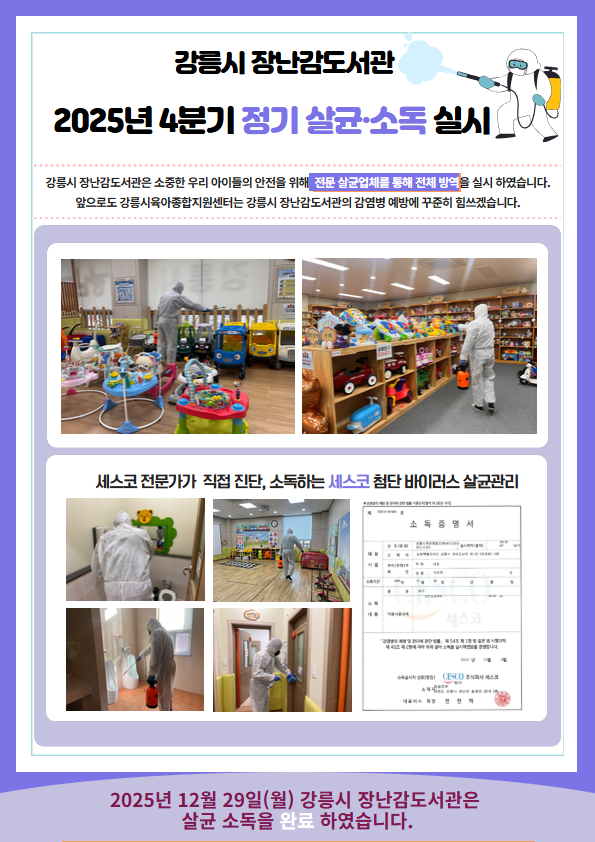 강릉시 장난감도서관 2025년 4분기 정기 살균 소독 실시 페이지 정보 작성자 관리자1 댓글 0건 조회 8회 작성일 26-01-07 09:13 목록 본문 이전글2026년 특별 신규장난감 입고안내 26.01.07 다음글2026년 강릉시 장난감도서관 추가 회원가입 및 연체, 분실, 파손 규정 안내 26.01.02